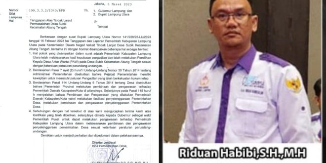 Informasi Terbaru yang dikeluarkan oleh Dirjen Bina Pemerintahan Desa secara resmi telah menerbitkan surat perihal Tanggapan atas pemberhentian kepala desa Subik Kecamatan Abung Tengah nomor: 100.3.5.5/0479/BPD yang ditujukan kepada Gubernur Lampung dan Bupati Lampung Utara. Poin terpentingnya terkait pembatalan jabatan Poniran HS selaku Kepala Desa dan mengangkat Yahya Pranoto, Riduan Habibi, SH, MH selaku Ketua LBH SMSI Provinsi Lampung, Faizal Afrianto, SH.I “FA & PARTNERS” dan Indra Jaya, SH, MH, CIL “IRH & PARTNERS” menanggapi hal tersebut bahwasannya pengangkatan Yahya Pranoto sebagai kepala desa subik sudah tepat dan sesuai dengan putusan Pengadilan dan peraturan yang ada “pungkas habibi”, sebagaimana telah diterbitkannya surat Bupati Lampung Utara dengan Nomor: 141/229/25-LU/2023 pada tanggal 16 Februari 2023 tentang tanggapan dan laporan pemerintah kabupaten lampung utara pada Kementerian Dalam Negri mengenai permasalahan tindak lanjut Desa Subik.