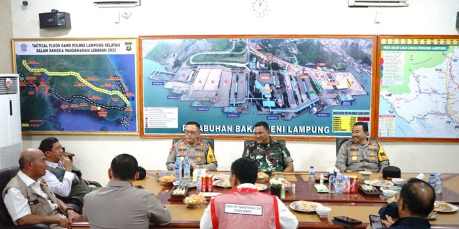 Lampung Selatan (sundalanews.com) – Kapolda Lampung Irjen Pol Helmy Santika bersama Wakapolda Lampung Brigjen Pol Umar Effendi, mendampingi Menko PMK (Menteri Koordinator Bidang Pembangunan Manusia dan Kebudayaan) Prof. Dr. Muhadjir Effendy dan Kabaharkam Polri Komjen Pol Fadil Imran dalam kegiatan pantauan arus balik lebaran 2023 di pelabuhan penyeberangan Bakauheni Lampung Selatan, Selasa (25/4/2023).