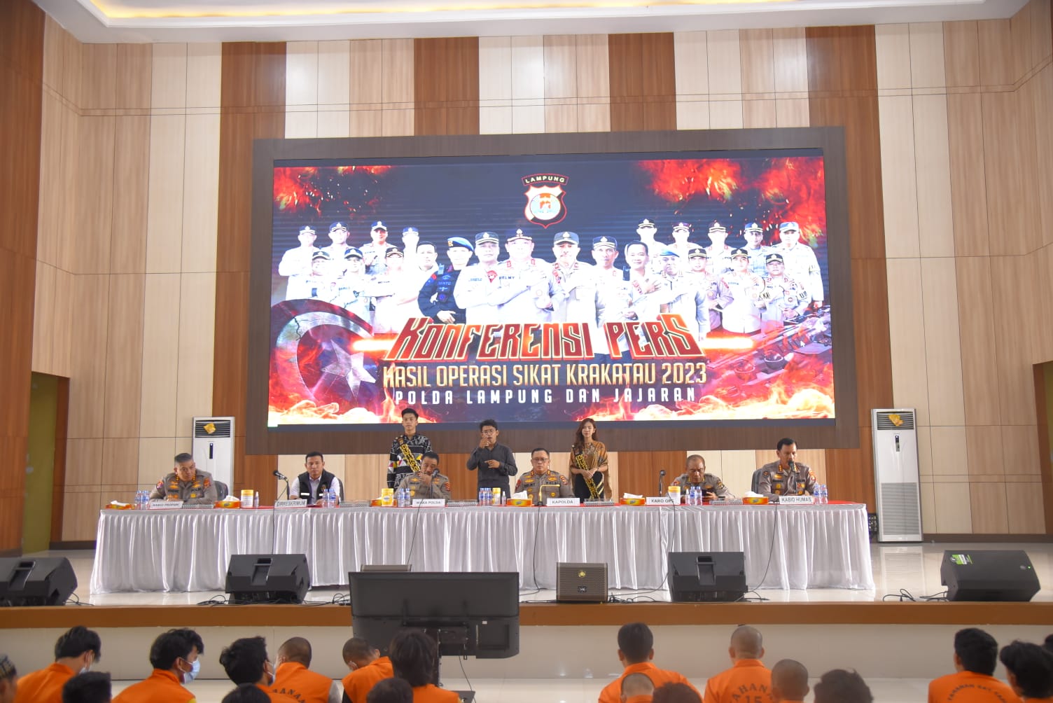 Lampung Selatan ( sundalanews.com) – Kapolda Lampung Irjen Pol Helmi Santika dan Wakapolda Lampung Brigjen Pol Umar Effendi berserta Karo Ops Polda Lampung Kombes Pol Amiludin Roemtaat, Dir Reskrimum Polda Lampung Kombes Pol Reynold EP Hutagalung, Kabid Humas Polda Lampung Kombes Pol Zahwani Pandra Arsyad, Kabid Propam Polda Lampung Kombes Pol Andre, melaksanakan Konferensi Pers Hasil Operasi Sikat Krakatau Tahun 2023 Polda Lampung dan Polres/Ta Jajaran di GSG Presisi Polda Lampung. Selasa (30/05/2023).