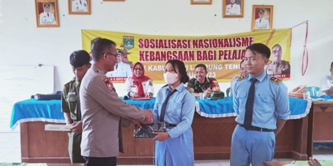 Lampung Tengah (sundalanews.com) – Bertempat di aula Kecamatan Terusan Nunyai, Kapolres Lampung Tengah, Polda Lampung AKBP Doffie Fahlevi Sanjaya,S.I.K., M.Si melalui Kasat Binmas AKP Yuswantoro melaksanakan pembinaan dan penyuluhan (Binluh) tentang wawasan Kebangsaan kepada para pelajar SMAN 1 dan SMKN 1 Kec. Terusan Nunyai Kab. Lamteng. Kamis (4/5/23)