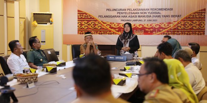 BANDAR LAMPUNG (sundalanews.com) – Wakil Gubernur Lampung Chusnunia Chalim mengikuti Acara Peluncuran Program Pelaksanaan Rekomendasi Penyelesaian Non Yudisial Pelangggaran Hak Asasi Manusia (HAM) Berat di Indonesia secara virtual, oleh Presiden Joko Widodo ( Jokowi ) di Rumoh Geudong, Kabupaten Pidie, Provinsi Aceh.