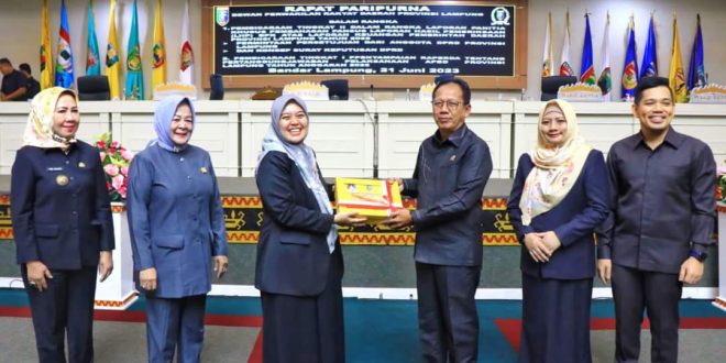 Bandar Lampung (sundalanews.com) – Wakil Gubernur Chusnunia menghadiri Rapat Paripurna DPRD Provinsi Lampung dalam rangka Penyampaian Rancangan Peraturan Daerah Tentang Pertanggungjawaban pelaksanaan APBD Provinsi Lampung Tahun Anggaran 2022, di Ruang Sidang DPRD Provinsi Lampung, Rabu (21/06/2023).