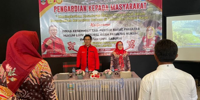 PESISIR BARAT (SUNDALANEWS.COM) – Dinas Kesehatan (Dinkes) Kabupaten Pesisir Barat (Pesibar) bekerjasama dengan Biro Konsultasi dan Bantuan Hukum (BKBH) Fakultas Hukum Universitas Sang Bumi Ruwa Jurai (Saburai) Lampung dengan disponsori oleh Ikatan Alumni Fakultas Hukum (IKAFAH) Universitas Saburai, menggelar kegiatan sosialisasi dalam rangka Pengabdian Kepada Masyarakat dengan tema “Meningkatkan Kesadaran Hukum Masyarakat dalam Mewujudkan Ketertiban Hukum di Kabupaten Pesisir Barat” yang dilaksanakan selama 2 Hari (15-16 Juli 2023) di Aula Hotel Sartika, Sabtu (15/7).