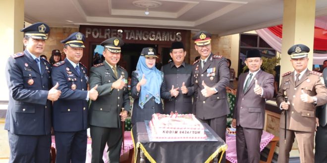 Tak henti disana, ditenda utama Dandim 0424/TGM, Letkol Inf Vicky Heru Harsanto didampingi Forkopimda juga menyerahkan kue ulah tahun kepada Kapolres AKBP Siswara Hadi Chandra yang juga didampingi Ketua PC Bhayangkari Nia Siswara.