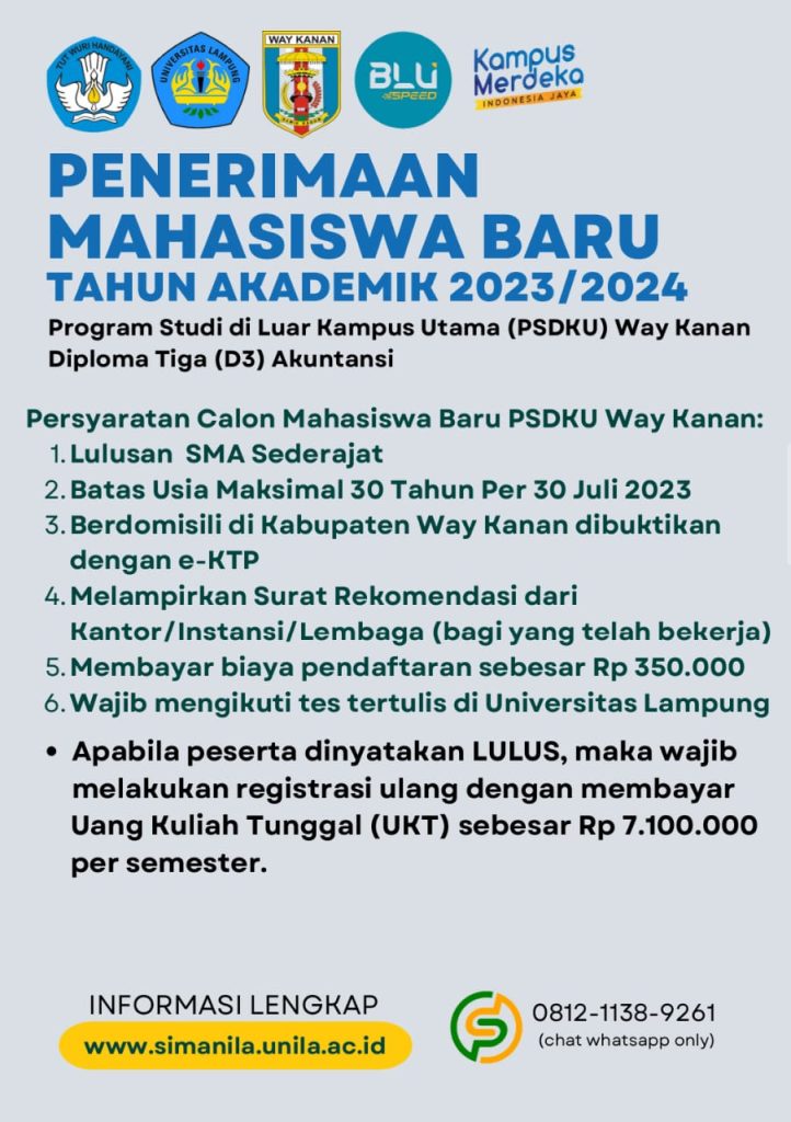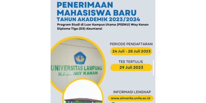 Way Kanan (Sundalanews.com) – Universitas Lampung (UNILA) Program Studi Diluar Kampus Utama (PSDKU) Way Kanan membuka Penerimaan Mahasiswa Baru Program Akademik Tahun 2023/2024.