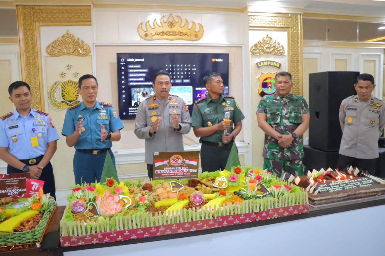 Sementara itu, Wakapolda Lampung mewakili Kapolda Lampung Irjen Pol Helmy Santika S.H.S.I.K.M.Si., yang sedang melaksanakan tugas di Jakarta, memberikan apresiasi dan menyampaikan ucapan terima kasih kepada Danrem, Danlanal, Danlanud dan Danbrigif yang telah memberikan kejutan pada kami di hari Bhayangkara ke 77.