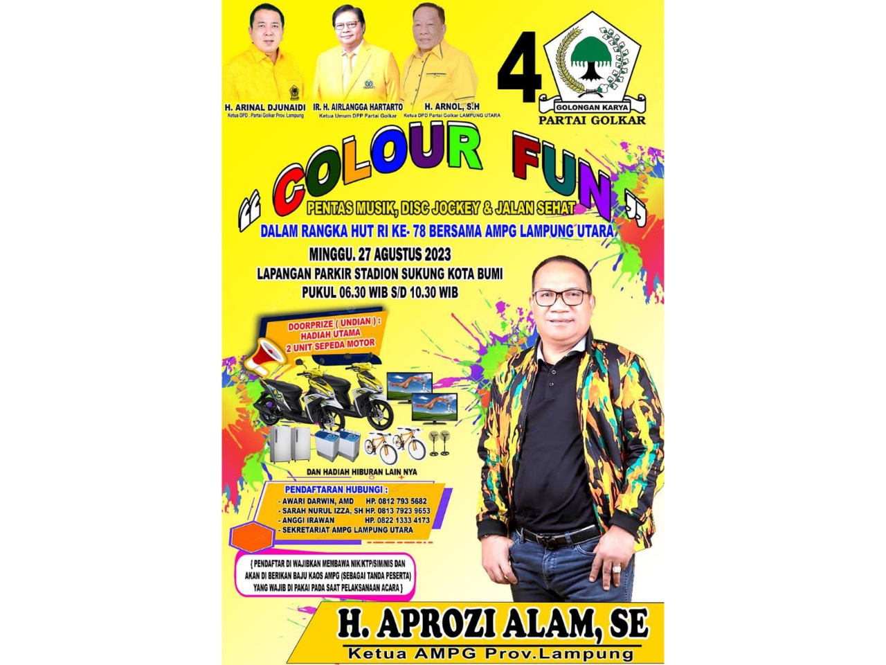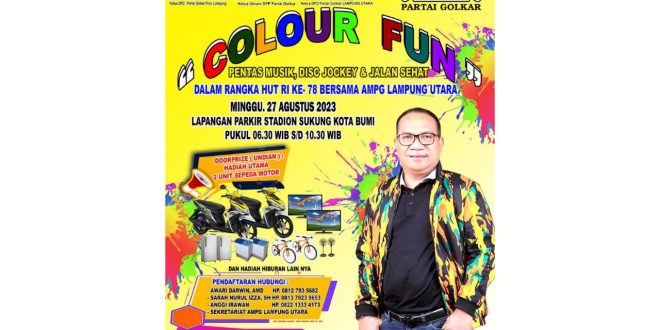 Lampung Utara (sundalanews.com) – Angkatan Muda Partai Golkar (AMPG) Lampung Utara (Lampura) akan menggelar Colour Fun dalam rangka memperingati HUT Ke 78 RI di stadion Sukung, Kotabumi, Lampura pada 27 Agustus 2023 pukul 06.00 pagi.