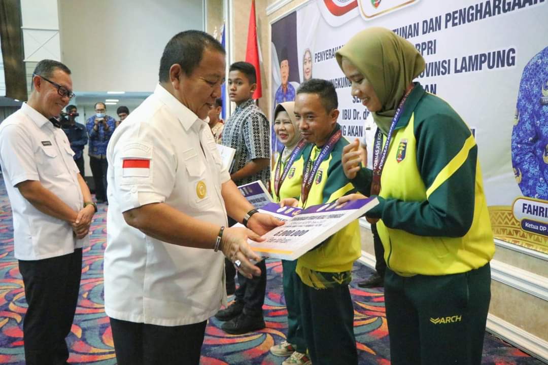 Gubernur juga memberikan apresiasi kepada para atlet Kontingen Provinsi Lampung yang telah meraih prestasi mendapatkan medali pada PORNAS ke-16 KORPRI Tahun 2023 di Jawa Tengah.