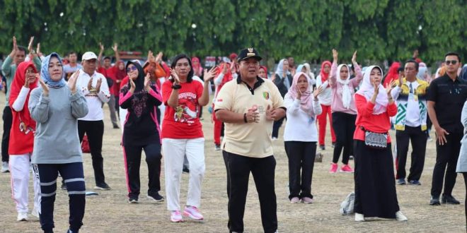 BANDAR LAMPUNG (sundalanews.com) – Gubernur Lampung, Arinal Djunaidi mengikuti kegiatan Senam Kesegaran jasmani bersama seluruh jajaran pejabat dan staf di Lingkungan Pemerintah Provinsi Lampung, yang digelar di Lapangan Korpri Komplek Kantor Gubernur Lampung, Jumat (18/08/2023).
