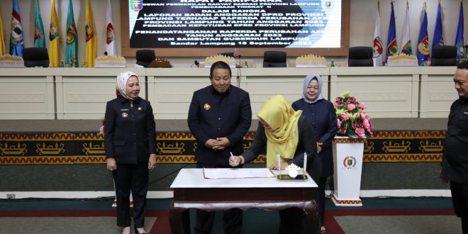 BANDAR LAMPUNG (sundalanews.com) – Gubernur Lampung Arinal Djunaidi dan Pimpinan DPRD Provinsi Lampung menandatangani Raperda Perubahan APBD Provinsi Lampung Tahun Anggaran 2023 dalam Sidang Paripurna Pembicaraan Tingkat II Persetujuan Bersama Terkait Rancangan Perubahan Anggaran Daerah APBD Provinsi Lampung Tahun Anggaran 2023, di Ruang Sidang Paripurna, Senin, (18/09/2023).