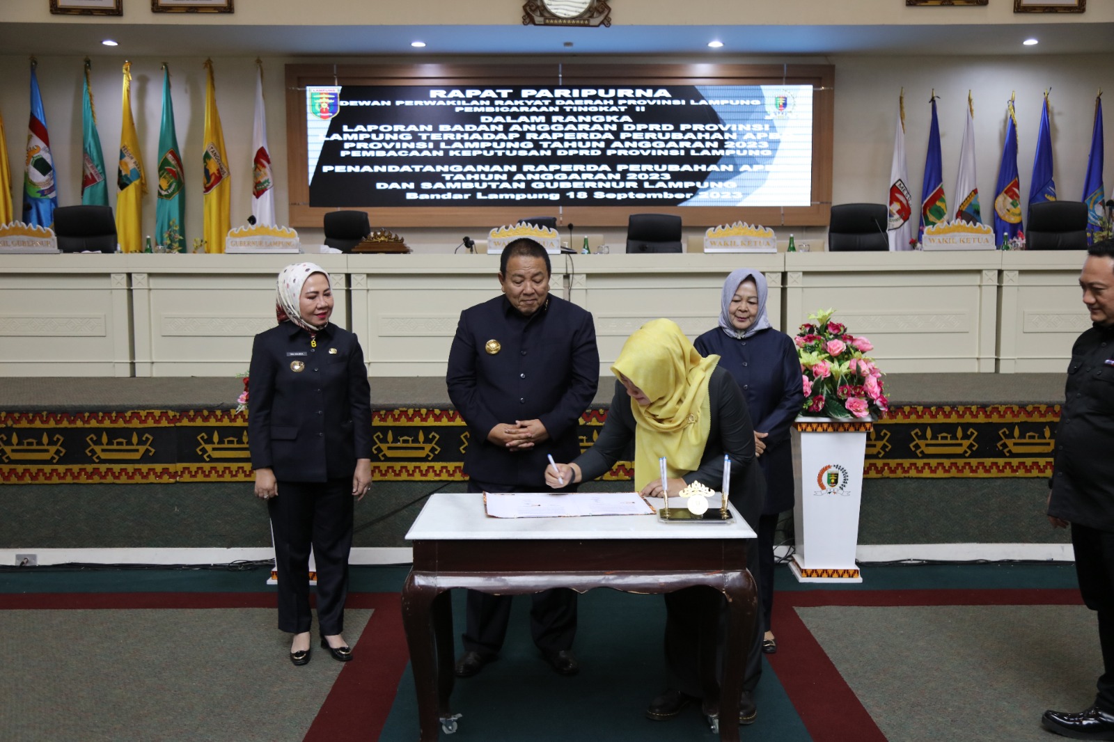 Gubernur Lampung Arinal Djunaidi dan Pimpinan DPRD Tandatangani Raperda Perubahan APBD Provinsi Lampung Tahun Anggaran 2023