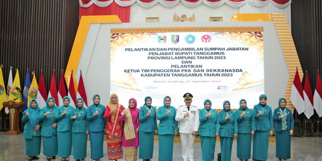 BANDAR LAMPUNG (sundalanews.com) – Ketua Tim Penggerak PKK Provinsi Lampung Ibu Riana Sari Arinal melantik Hellen Veranica Mulyadi sebagai Penjabat (Pj) Ketua Tim Penggerak PKK dan Dekranasda Kabupaten Tanggamus di Aula Mahan Agung, Rabu (27/9/2023).