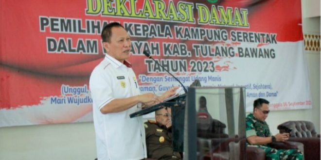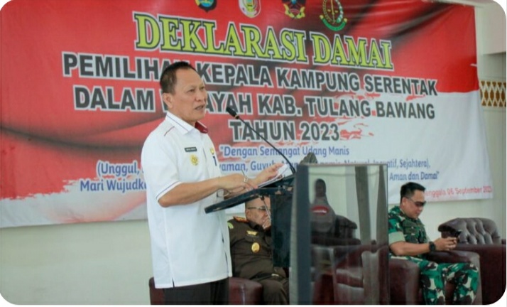 Tulang Bawang (Sundalanews.com) – Penjabat Bupati Tulang Bawang Bapak Drs Qudrotul Ikhwan MM Menghadiri Acara Deklarasi Damai Pemilihan Kepala Kampung Serentak Tahun 2023 Dalam Wilayah kabupaten Tulang Bawang. Kegiatan ini dilaksanakan di GSG Menggala Tulang Bawang, Rabu, (06/09/2023)