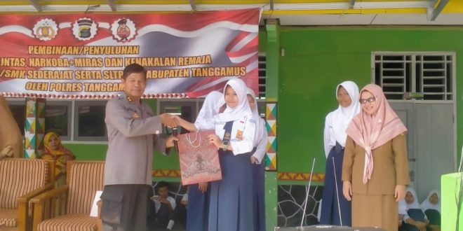 Tanggamus (sundalanews.com) – Polres Tanggamus menggelar program pembinaan, penyuluhan dan sosialisasi kepada siswa SMA/SMK/SLTP se-Kabupaten Tanggamus yang kali ini dilaksanakan di SMPN 1 Talang Padang, Selasa, 26 September 2023 pukul 07.30 WIB.