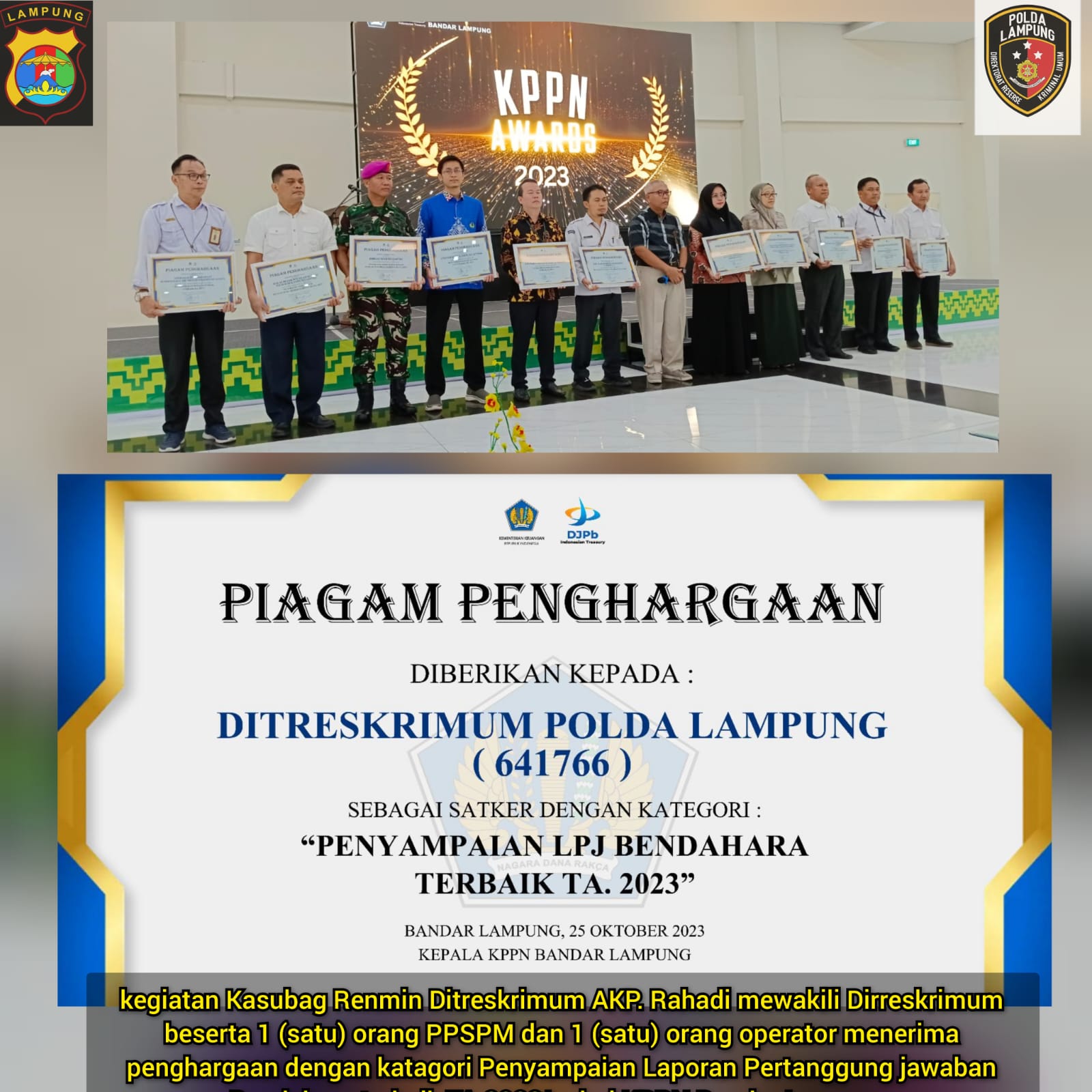 Kabid Humas Polda Lampung Kombes Pol Umi menyampaikan, penghargaan ini merupakan hasil dari kinerja personil Ditreskrimum atas pertangung jawaban bendarahara terbaik tahun anggaran 2023.