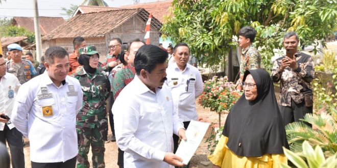 Pesawaran (sundalanews.com) – Menteri Agraria dan Tata Ruang/Kepala Badan Pertanahan Nasional (ATR/BPN) Hadi Tjahjanto didampingi Bupati Pesawaran Dendi Ramadhona menyerahkan sertifikat hak milik kepada masyarakat di Kabupaten Pesawaran, Lampung, Kamis (26/10/2023).