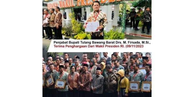 Tubaba (sundalanews.com) – Wakil Presiden Republik Indonesia Prof. Dr. (H.C.) K.H. Ma’ruf Amin, memberikan secara langsung piagam Penghargaan Insentif Fiskal Kinerja kepada Penjabat (Pj) Bupati Tulangbawang Barat (Tubaba) Drs. M. Firsada, M.SI., yang dilaksanakan di Istana Wakil Presiden Jl. Medan Merdeka Selatan, Jakarta, Kamis (23/11/2023).