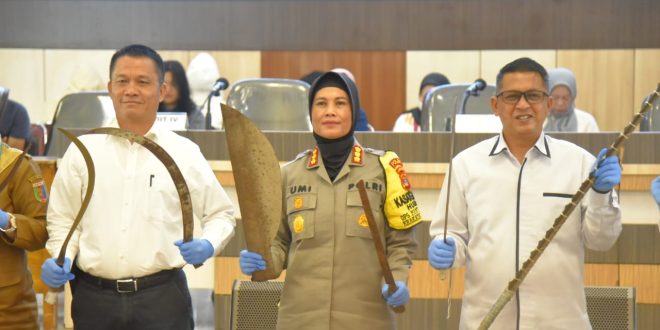 Adapun barang bukti yang behasil diamankan 14 (empat belas) bilah senjata tajam yang menyerupai Celurit terbuat dari plat besi berbagai ukuran, 3 (tiga) bilah senjata tajam jenis pedang terbuat dari plat best, 1 (satu) buah senjata yang menyerupal gergafi yang terbuat dari rangka besi berukuran + 100 (seratus) Cm, 1 (satu) buah mesin gerinda berikut mata gerinda, 9 (sembilan) unit Sp. Motor (R2) berbagai merk, 21 (dua puluh satu) unit handphone berbagai macam merk (1 unit handphone merk Oppo A3s warna Hitam.