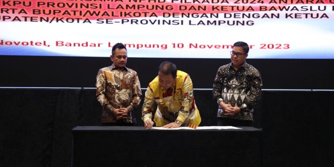 BANDAR LAMPUNG (sundalanews.com) – Gubernur Lampung Arinal Djunaidi bersama Ketua KPU Provinsi Lampung Erwan Bustami dan Ketua Bawaslu Provinsi Lampung Iskardo P. Panggar melakukan penandatanganan naskah perjanjian hibah daerah (NPHD) Pilkada 2024 dalam Rakor Gabungan Pemilu 2024 di Ballroom Hotel Novotel Bandar Lampung, Jumat (10/11/2023) malam.