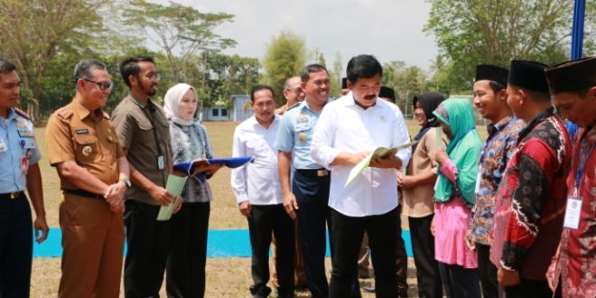 TULANGBAWANG (sundalanews.com) – Sekretaris Daerah Provinsi Lampung Fahrizal Darminto mewakili Gubernur Lampung Arinal Djunaidi, menghadiri penyerahan Sertifikat Pendaftaran Tanah Sistematis Lengkap (PTSL) kepada warga masyarakat oleh Menteri Agraria dan Tata Ruang/Kepala Badan Pertanahan Nasional (ATR/BPN), Hadi Tjahjanto di Lanud Pangeran M Bun Yamin Kp. Astra Kasetra Kecamatan Menggala Kabupaten Tulang Bawang, Selasa (28/11/2023).