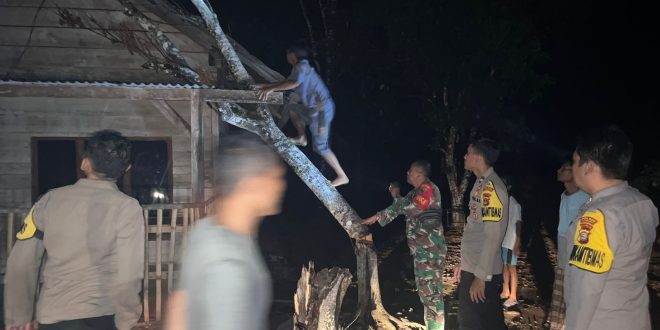 Tulang Bawang Barat (sundalanews.com) – Sektor Tulang Bawang Tengah, Polres Polres Tulang Bawang Barat bergerak cepat membantu warga yang terdampak angin puting beliung di kelurahan Panaragan jaya dan tiyuh Panaragan jaya utama Kecamatan Tulang bawang tengah Kabupaten Tulang Bawang Barat. Angin puting beliung ini terjadi pada, Jum’at (10/11/2023) malam sekira pukul 19.00 Wib yang mengakibatkan sejumlah rumah warga mengalami kerusakan.