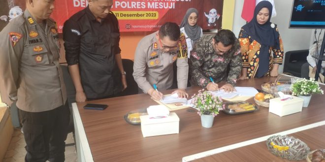 Mesuji (sundalanews.com) – Kapolres Mesuji Polda Lampung melaksanakan Coffee Morning sekaligus Penandatanganan Nota Kesepakatan dengan KPU Kabupaten Mesuji, bertempat di Aula Kantor KPU Desa Brabasan Kecamatan Tanjung Raya Kabupaten Mesuji, Senin (11/12/23).