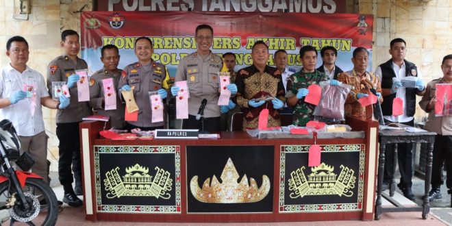 Dalam kesempatan itu, Kapolres menyampaikan bahwa pihaknya menghadirkan barang bukti yang telah dilakukan penyitaan dan penetapan, termasuk dari warga kecamatan pugung, penemuan senjata api rakitan yang telah diserahkan ke Polres Tanggamus