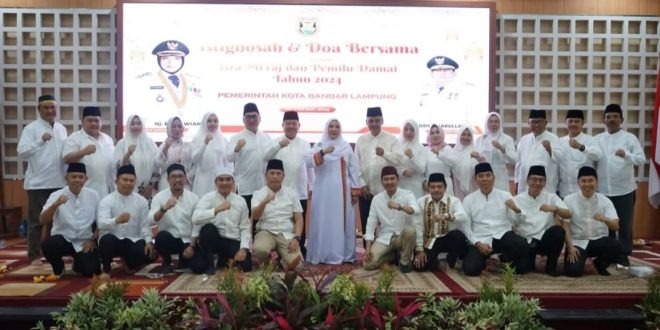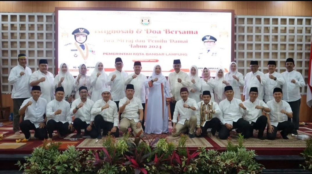 Bandar Lampung (sundalanews.com) – Forum Komunikasi Daerah (Forkopimda) dan Forum Komunikasi Umat Beragama (FKUB) di Bandar Lampung melaksanakan istighosah dan Do’a bersama dalam rangka memperingati Isra Mi’raj 1445 H dan Pemilu Damai tahun 2024, di gedung Sumergou Kota Bandar Lampung, Sabtu (10/2/2024).