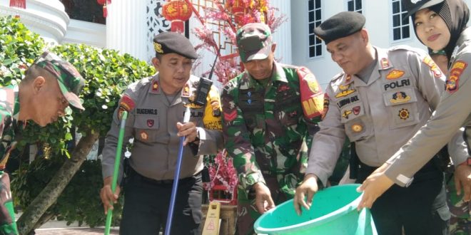 Bandar Lampung (sundalanews.com) – Puluhan personel Polresta Bandar Lampung dan Kodim 0410 Kota Bandar Lampung diterjunkan dalam kegiatan bersih bersih tempat ibadah, Rabu (07/02/2024) pagi.