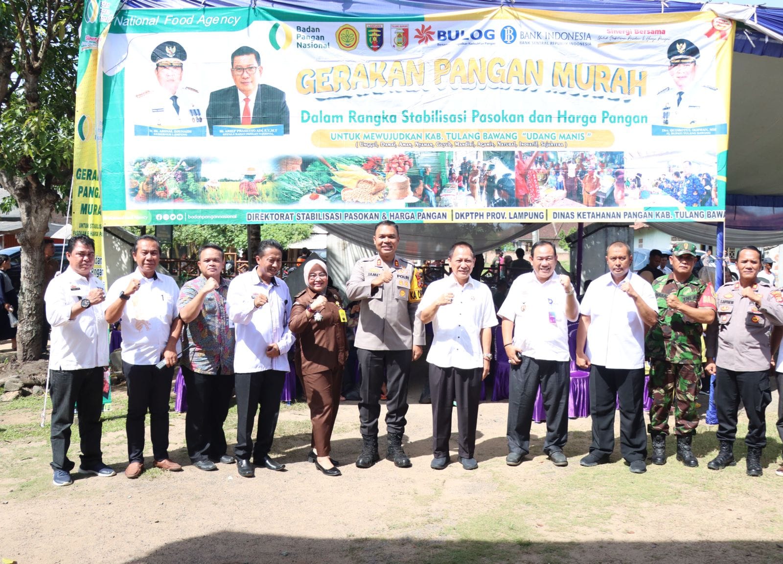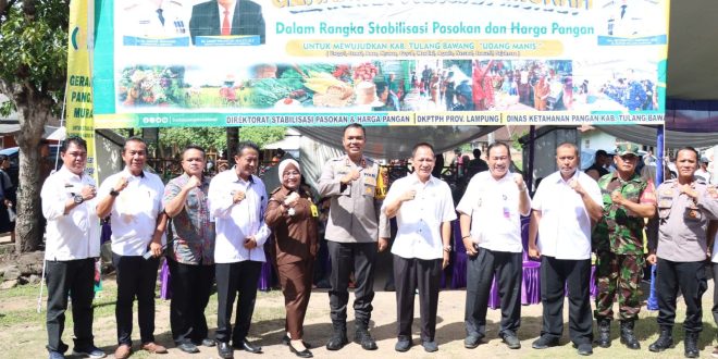 Tulang Bawang (sundalanews.com) – Kapolres Tulang Bawang, Polda Lampung, AKBP James H Hutajulu, SIK, SH, MH, MIK, didampingi PJU Polres menghadiri secara langsung kegiatan gerakan pangan murah (GPM) yang diselenggarakan oleh Pemerintah Kabupaten (Pemkab) Tulang Bawang di Kampung Tiuh Tohou, Kecamatan Menggala, Kabupaten setempat, Rabu (06/03/2024).