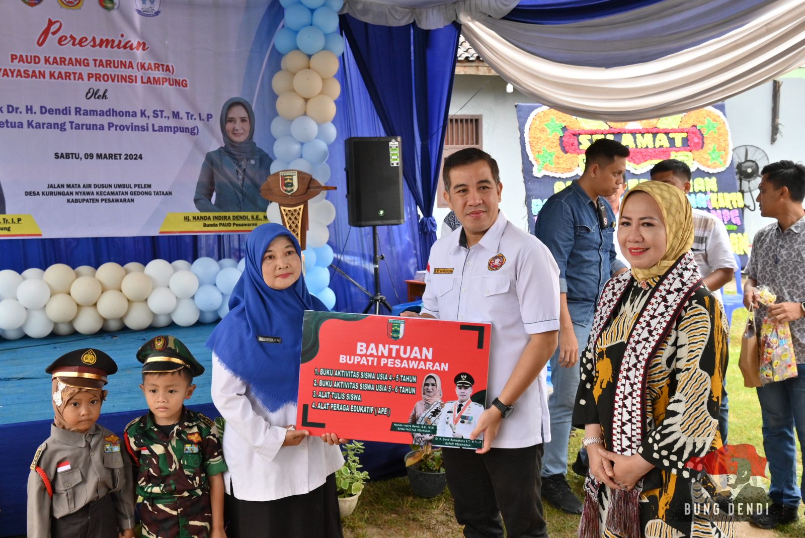 Pesawaran (sundalanews.com) – Ketua Karang Taruna Provinsi Lampung, Dendi Ramadhona meresmikan sekolah Pendidikan Anak Usia Dini yaitu PAUD KARTA (Karang Taruna) di Desa Umbul Pelem Kecamatan Gedong Tataan, Pesawaran, Sabtu (9/3/2024).