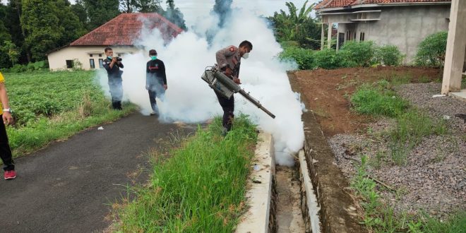 Penyemprotan fogging di pemukiman warga Pekon Kampung Baru dan sekitar lingkungan dilaksanakan oleh Polres Tanggamus.