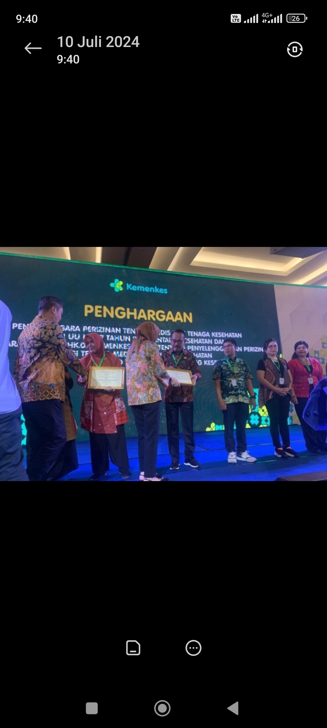 Penghargaan ini yang memberikan adalah Direktur Jenderal Tenaga Kesehatan, Kementerian Kesehatan pada acara “Advokasi/Uji Publik Regulasi Dalam Rangka Akselerasi Regulasi dan Perizinan Tenaga Medis dan Tenaga Kesehatan” di Swiss Belhotel Harbour Bay, Kota Batam, 8-9 Juli 2024.