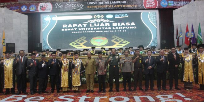 Rapat Luar Biasa Senat Universitas Lampung Dalam Rangka Dies Natalis Ke-59 ini merupakan kegiatan puncak dari perayaan hari jadi Unila ke-59 dengan tema “Be Strong: Transformasi Unila untuk Indonesia Emas”.