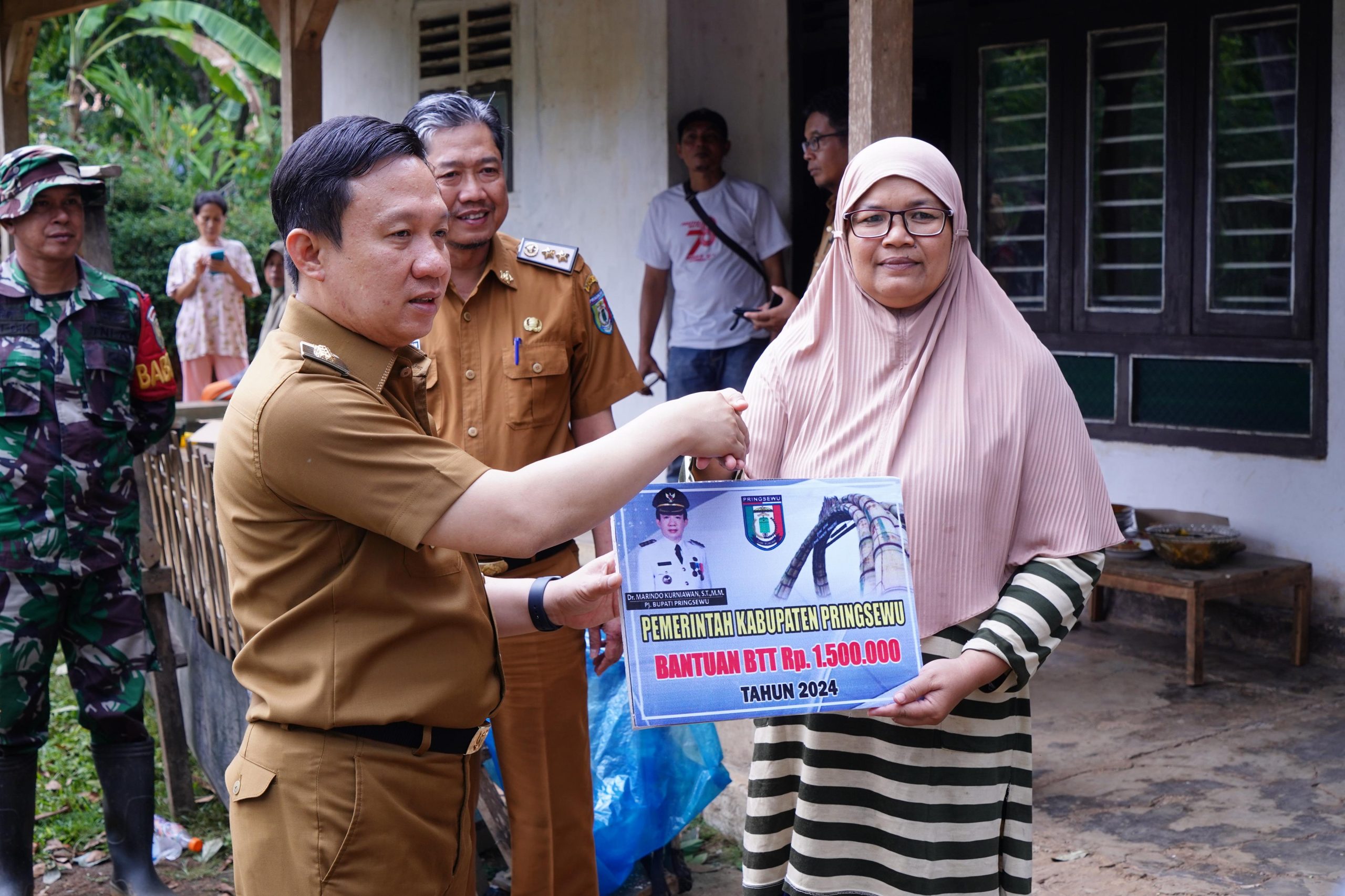 Pj Bupati Pringsewu Marindo Kurniawan saat menyerahkan bantuan sosial berupa dana perbaikan rumah, kids ware dan sembako kepada sejumlah warga korban terdampak bencana pada Selasa (5/11/2024) berharap bantuan tersebut dapat membantu meringankan beban penderitaan korban terdampak bencana.