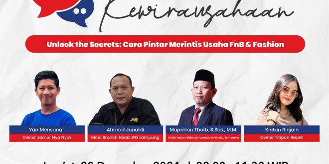 BANDAR LAMPUNG (sundalanews.com) – Institut Informatika dan Bisnis (IIB) Darmajaya bersama JNE (Jalur Nugraha Ekakurir) akan menggelar Talkshow Kewirausahaan bertajuk “Unlock the Secrets: Cara Pintar Merintis Usaha FnB & Fashion” pada Jumat, 20 Desember 2024. Acara inspiratif ini akan berlangsung di Aula Rektorat Gedung A Lantai 3 IIB Darmajaya mulai pukul 08.00 hingga 11.30 WIB.