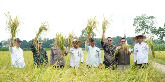 TUBABA (SUNDALANEWS.COM) – Dalam Upaya Mendukung Program Ketahanan Pangan Nasional Bupati Tulangbawang Barat (Tubaba) Ir. Novriwan Jaya, S.P, bersama jajaran Forkopimda Melakukan Panen Raya Padi Kelompok Tani Masyarakat Di Tiyuh Gading Kecana Kec. Tulangbawang Udik, Rabu (19/03/2025).