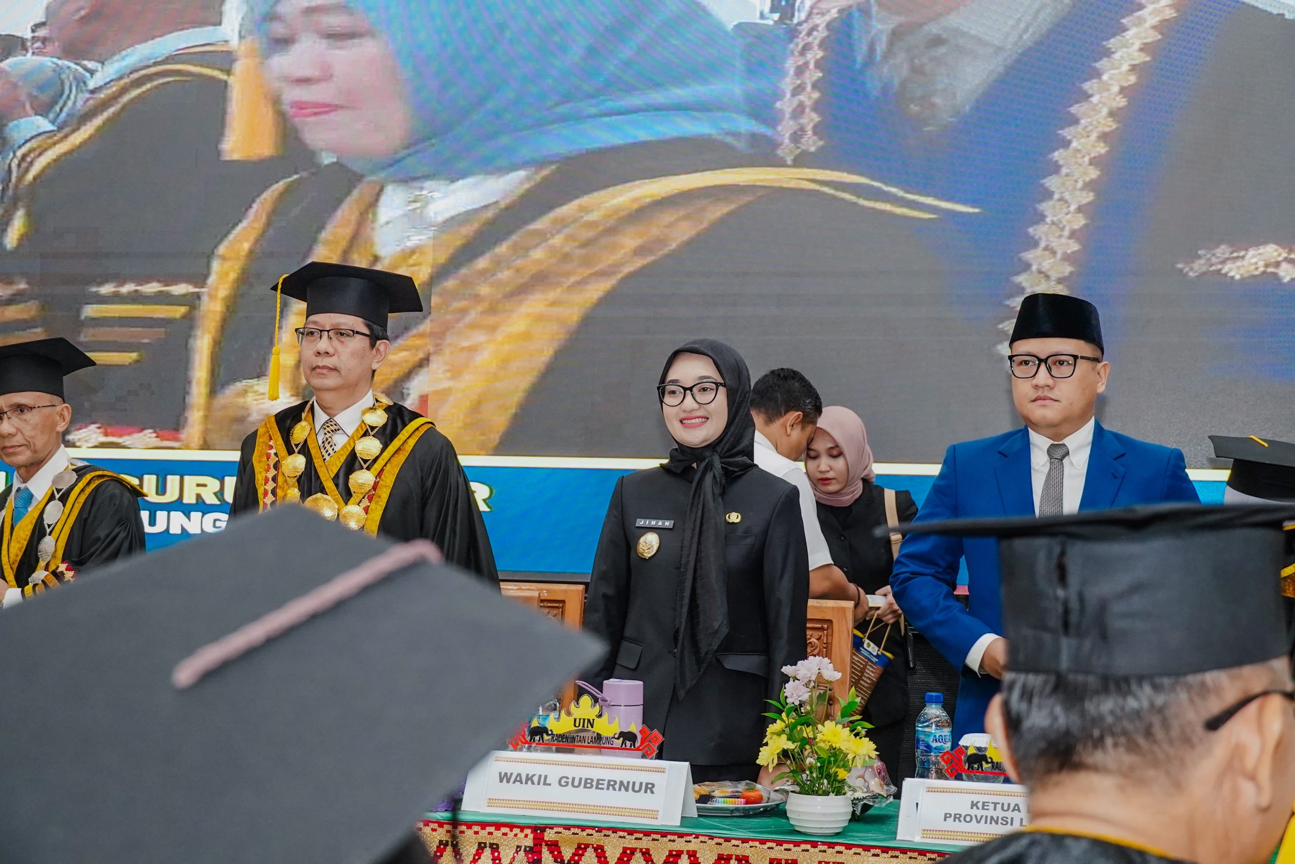 Hal tersebut diungkapkan Wakil Gubernur Lampung, Jihan Nurlela saat menghadiri Sidang Senat Terbuka dalam rangka pengukuhan 15 Guru Besar dari berbagai disiplin ilmu yang digelar oleh Universitas Islam Negeri (UIN) Raden Intan Lampung bertempat di Ballroom Universitas Islam Negeri (UIN) Raden Intan Lampung, Rabu (30/04/2025).