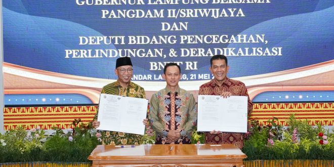Hal tersebut disampaikan Gubernur yang didampingi Ketua TP PKK Provinsi Lampung Purnama Wulan Sari Mirza saat menggelar silaturahmi dan ramah tamah bersama Pangdam II/Sriwijaya Mayjen TNI Ujang Darwis dan Deputi Bidang Pencegahan, Perlindungan, dan Deradikalisasi BNPT, Mayjen TNI Sudaryanto, di Mahan Agung, Rabu (21/5/2025) malam.