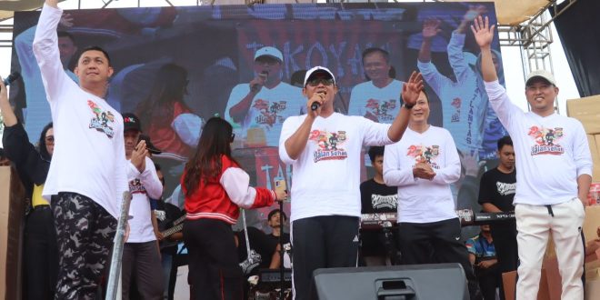 Lampung Tengah (sundalanews.com) – Ribuan masyarakat tumpah ruah memadati Taman Tugu Canang, Gunung Sugih, Kabupaten Lampung Tengah, untuk mengikuti kegiatan jalan sehat dan senam bersama yang digelar oleh Polres Lampung Tengah dalam rangka memperingati Hari Bhayangkara ke-79, Minggu pagi (29/6/25).