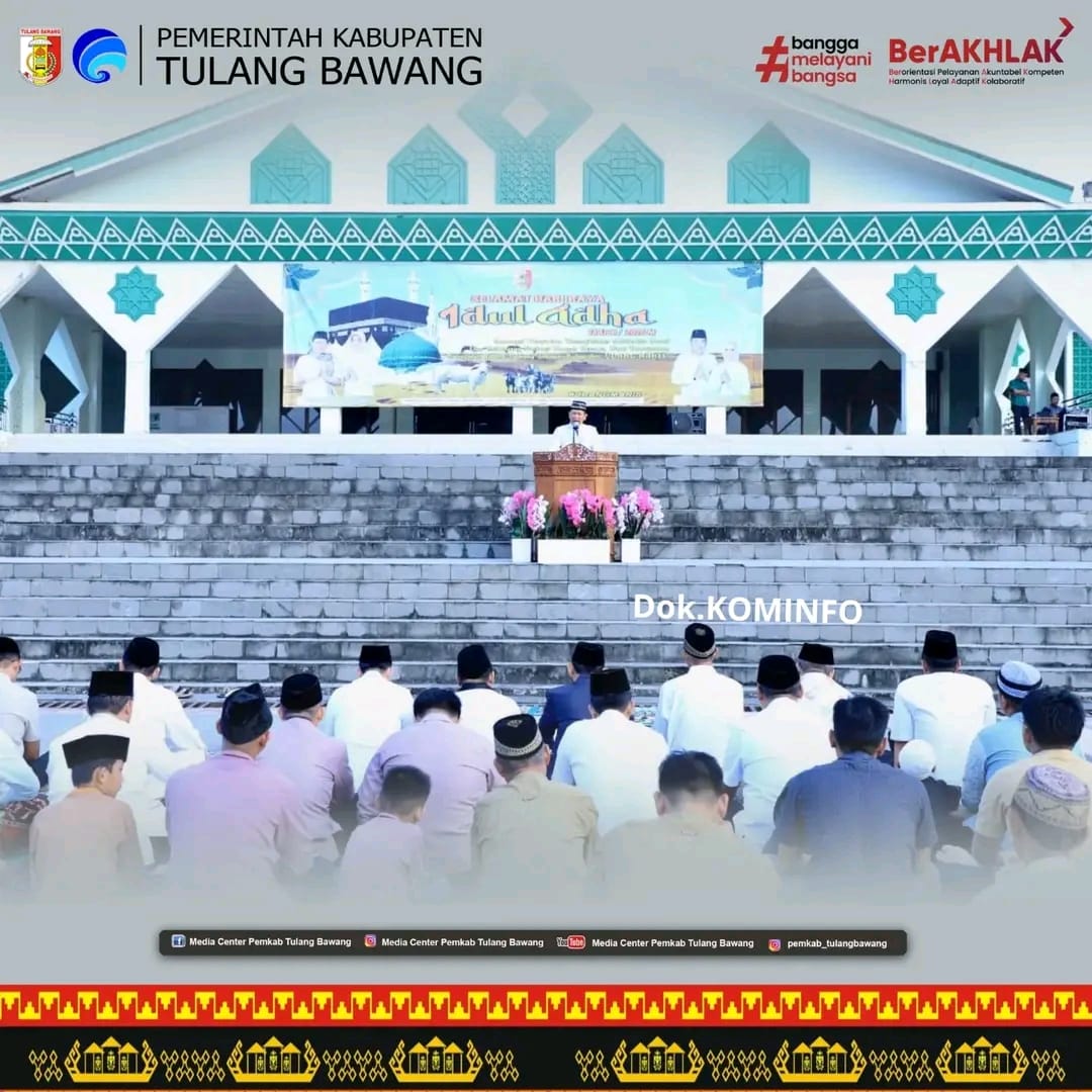 Pemerintah Kabupaten Tulang Bawang Menggelar Sholat Idul Adha 1446 H di Masjid Baiturrachman, Islamic Center Menggala, pada Jumat (06/06/2025). Kegiatan ini diikuti Bupati Drs. Qudrotul Ikhwan, M.M., Wakil Bupati Hankam Hasan, Forkopimda, jajaran OPD, serta masyarakat.