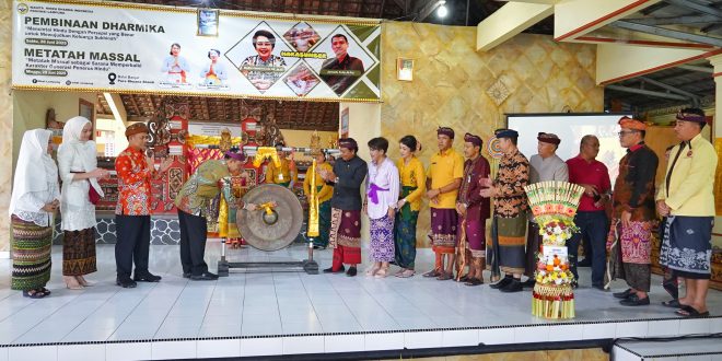 Pembukaan Pembinaan Dharmika dan Меtаtah Massal secara resmi ditandai dengan pemukulan gong oleh Sekretaris Daerah Provinsi Lampung, Marindo Kurniawan.
