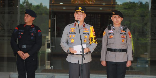 Lampung Selatan (sundalanews.com) – Polda Lampung menggelar Upacara Pemberangkatan Prosesi Pengambilan Air Suci. Kegiatan ini merupakan bagian dari kegiatan pembinaan tradisi dalam rangka memperingati Hari Ulang Tahun ke 79 Bhayangkara Tahun 2025. Upacara ini dipimpin oleh Wakapolda Lampung, Brigjen Pol Dr. Ahmad Ramadhan, S.H., M.Si., M.H., selaku Inspektur Upacara. Senin (17 Juni 2025).