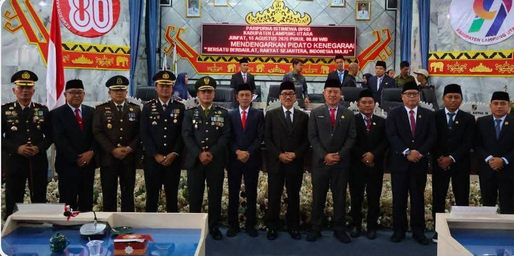 Kegiatan yang berlangsung di Ruang Rapat Paripurna DPRD Kabupaten Lampung Utara ini dihadiri oleh jajaran Forkopimda, para Kepala Organisasi Perangkat Daerah (OPD), Pimpinan dan Anggota DPRD Lampung Utara, serta tamu undangan lainnya, Jumat (15/08/2025).