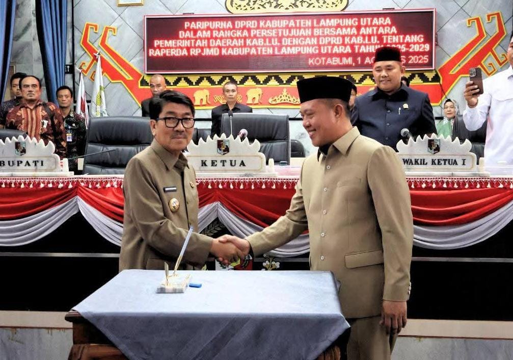 Kotabumi (sundalanews.com) — Bupati Lampung Utara, Dr. Ir. Hamartoni Ahadis, M.Si., menghadiri Rapat Paripurna DPRD Kabupaten Lampung Utara dalam rangka Pembahasan Rancangan Peraturan Daerah (Ranperda) tentang Rencana Pembangunan Jangka Menengah Daerah (RPJMD) Kabupaten Lampung Utara Tahun 2025–2029. Rapat berlangsung di Ruang Sidang DPRD dan dihadiri oleh Ketua DPRD beserta jajaran, Forkopimda, Sekretaris Daerah, para kepala perangkat daerah, dan unsur terkait lainnya, Jumat (01/08/2025).