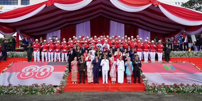 “Sebagaimana dikatakan Bung Karno, Bangsa yang besar adalah bangsa yang menghormati jasa pahlawannya. Maka hari ini kita meneruskan perjuangan mereka melalui kerja nyata dan pengabdian yang sungguh-sungguh. Dengan tema HUT Ke-80 Republik Indonesia Bersatu Berdaulat, Rakyat Sejahtera, Indonesia Maju, mari kita jadikan semangat kemerdekaan sebagai inspirasi dalam membangun bangsa,” ujar Gubernur.
