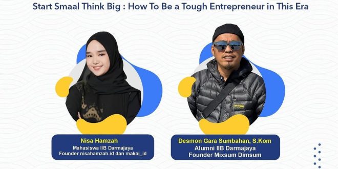 Mengusung tema “Start Small, Think Big: How to Be a Tough Entrepreneur in This Era”, kegiatan ini menghadirkan dua narasumber inspiratif yakni Nisa Hamzah, Mahasiswa IIB Darmajaya sekaligus Founder nisahamzah.id dan makai_id, serta Desmon Gara Sumbahan, S.Kom, Alumni IIB Darmajaya dan Founder Mixsum Dimsum.