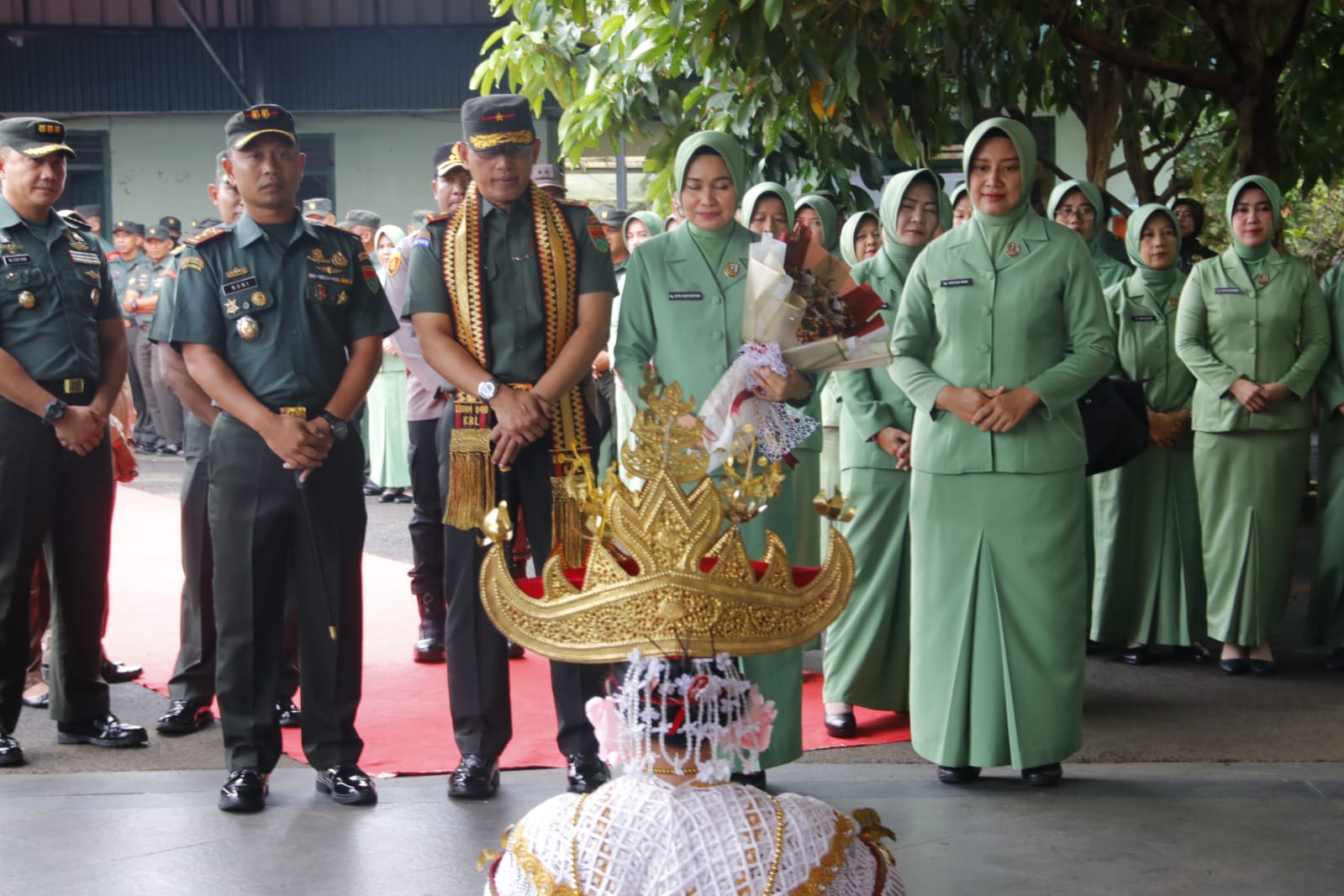 Letkol Roni Hermawan memimpin penyambutan rombongan Danrem dengan rangkaian acara adat Lampung, mulai dari pengalungan tapis (kain tradisional), pemberian hand bucket, hingga pertunjukan Tari Sigeh Pengunten. Dalam sambutannya, Dandim menyampaikan laporan kesiapan satuan dan komitmen Kodim 0410/KBL dalam mendukung program Korem 043/Gatam.