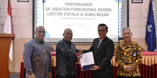Bandar Lampung (sundalanews.com) — Institut Informatika dan Bisnis (IIB) Darmajaya kembali mencatat capaian membanggakan. Prof. Ir. Suhendro Yusuf Irianto, M.Kom., Ph.D., dosen Fakultas Ilmu Komputer, resmi menerima Surat Keputusan (SK) jabatan fungsional Guru Besar bidang Informatika dari LLDIKTI Wilayah II pada Selasa (19/8/25). Dalam kesempatan tersebut, beliau didampingi Wakil Rektor Bidang Akademik IIB Darmajaya, Dr. Sutedi, S.Kom., M.T.I.
