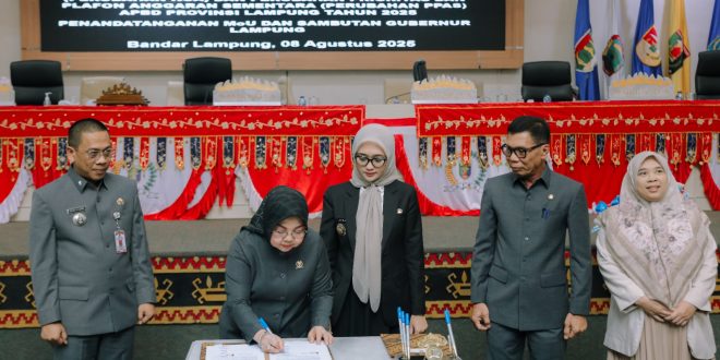 Bandar Lampung (sundalanews.com) – Pemerintah Provinsi Lampung dan DPRD Provinsi Lampung menandatangani Nota Kesepahaman (MoU) Perubahan Kebijakan Umum APBD (KUA) dan Perubahan Prioritas dan Plafon Anggaran Sementara (PPAS) APBD Provinsi Lampung Tahun Anggaran 2025.